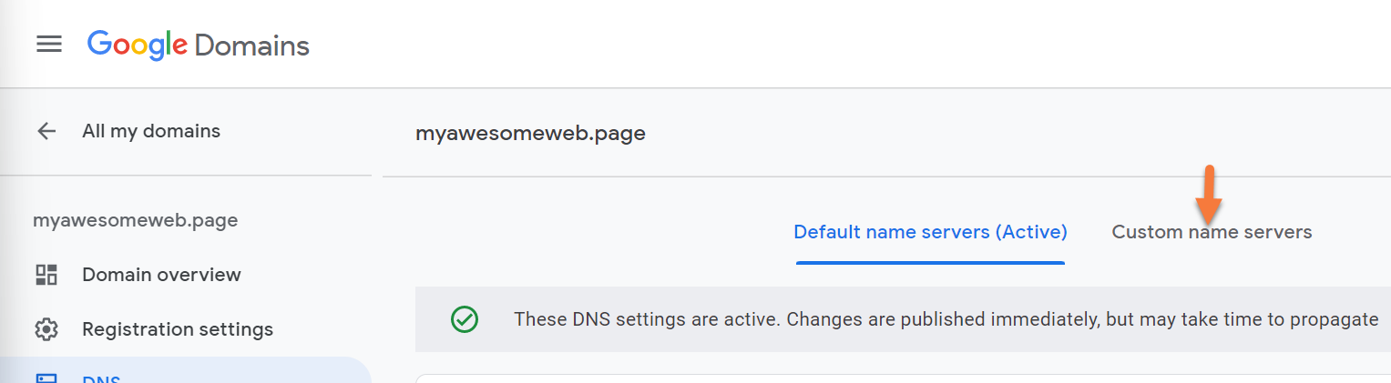 Once the DNS settings page loads, click “Custom name servers” at the top of the page: