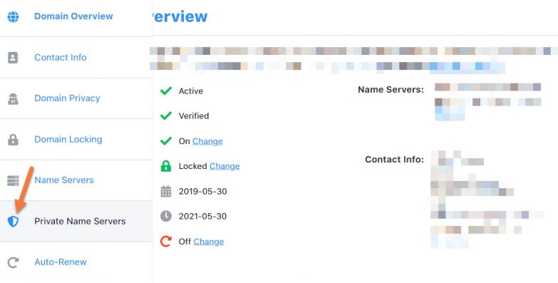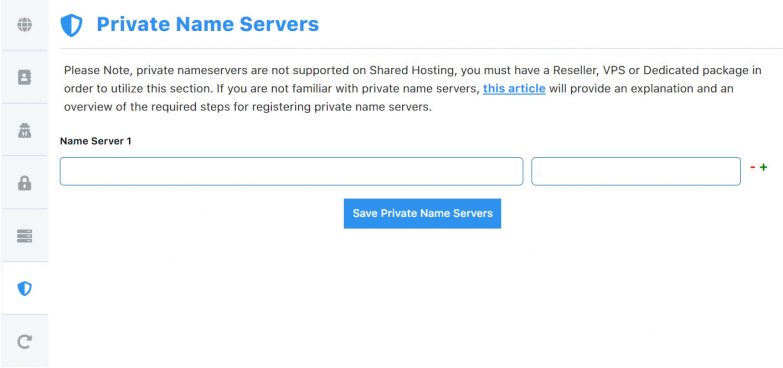 When the domain tools open, click the shield icon on the left to open the Private Nameserver editor.