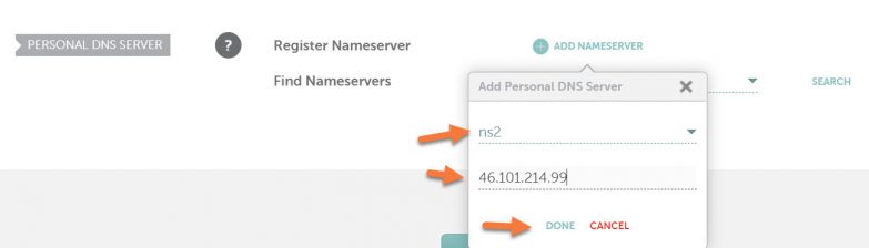To register your second private nameserver, click the + Add Nameserver button again. In the drop-down menu, click ns2. Then enter the IP address for our secondary nameserver: 46.101.214.99.