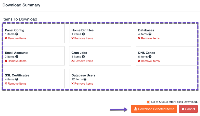 Step 5: You will be presented with a list of Items To Download. To download everything part of a cPanel Account, leave all these selected, then click Download Selected Items.