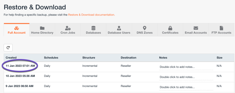 Step 4: The Full account backup restore option will open. Choose the backup date you want to restore by clicking on it, then scroll down the page and click on the Restore button.