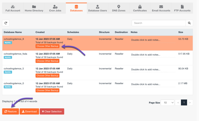 Step 4: After clicking Databases, you will be given a list of available database backups. In my example, I’m going to restore a database called “cchostingdemos_8” from the latest backup, so I will choose the backup at the top by clicking on it. If you’re using WordPress, here’s a helpful guide on how to find the name of your WordPress database.