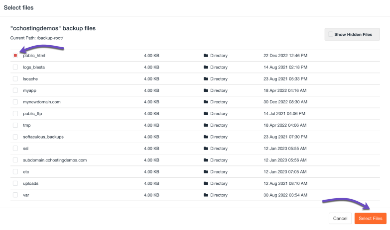 In my example, I will restore all the files inside the public_html directory, which belongs to my primary domain. If you’re restoring the files belonging to an addon domain, here’s a guide on finding the document root of your site.