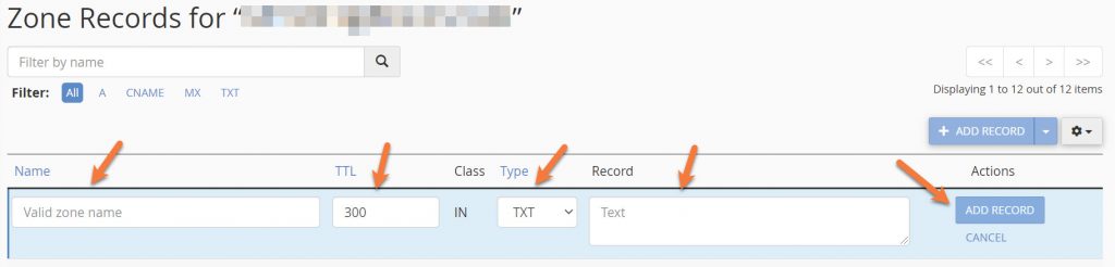 Adding these records is very easy. To do this, return to the zone editor and click the blue Add record button.