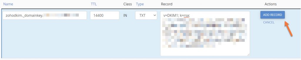 In the name field, enter zohodkim._domainkey.yourdomain.tld where ‘yourdomain.tld’ is your domain name.