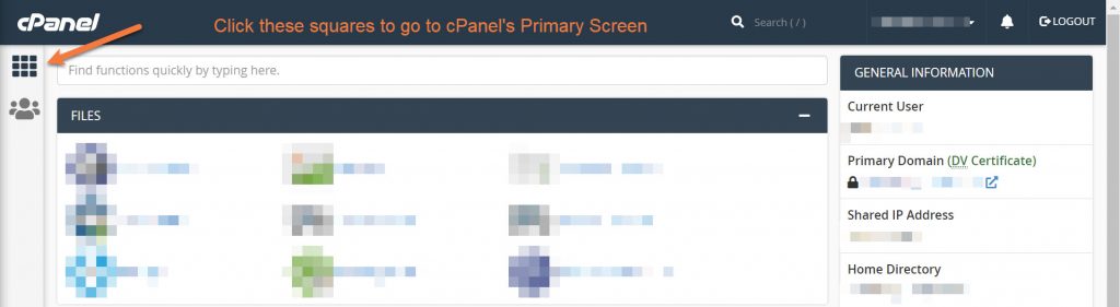 Navigate back to the main cPanel page by clicking the square box with 6 inner squares in the top left corner of cPanel.