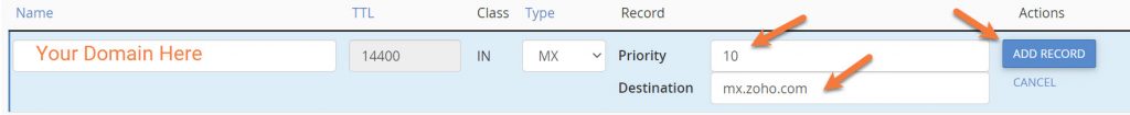 Enter mx.zoho.com and click the blue Add Record button in the Destination field.
