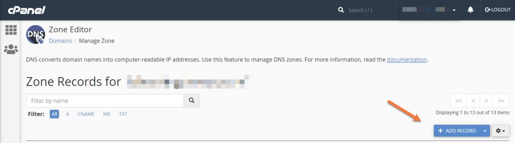 To add Zoho’s MX records to your DNS Configuration, navigate back to your cPanel > DNS > Zone Editor and click the blue + Add Record button in the mid-top right.