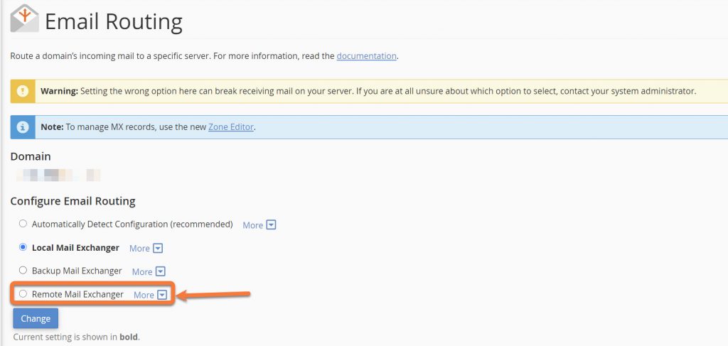 In the Email Routing Setup screen, you want to choose Remote Mail Exchanger. This instructs cPanel that you use an external mail service to send/receive email.