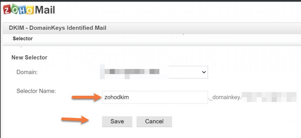 Next, you’ll be asked to give your selector a name. This name can be anything. For example, I’m going to use zohodkim. After you’ve named your selector, click save.