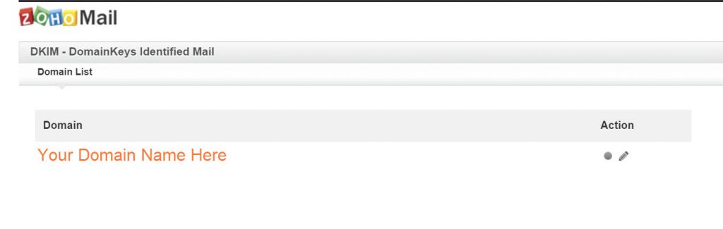You will be transferred to the Zoho Mail DKIM – DomainKeys Identified Mail panel where you will see your domain listed, along with a circle icon and a pencil icon. Like below: