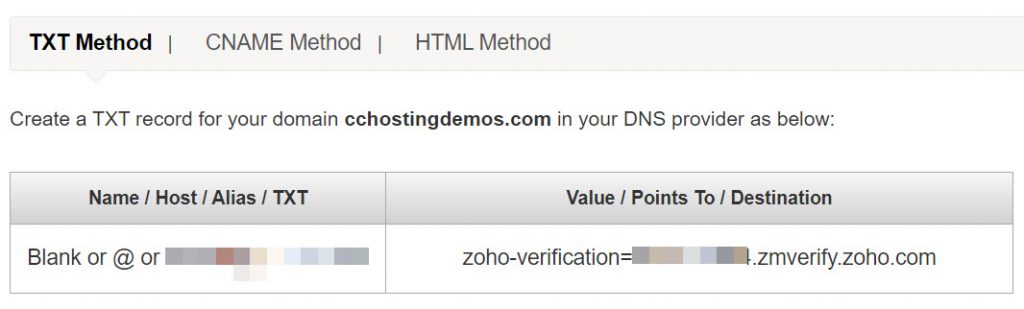 Under Record, enter zoho-verification=<yourcode>.zmverify.zoho.com where “yourcode” is the random code assigned to your record by Zoho.