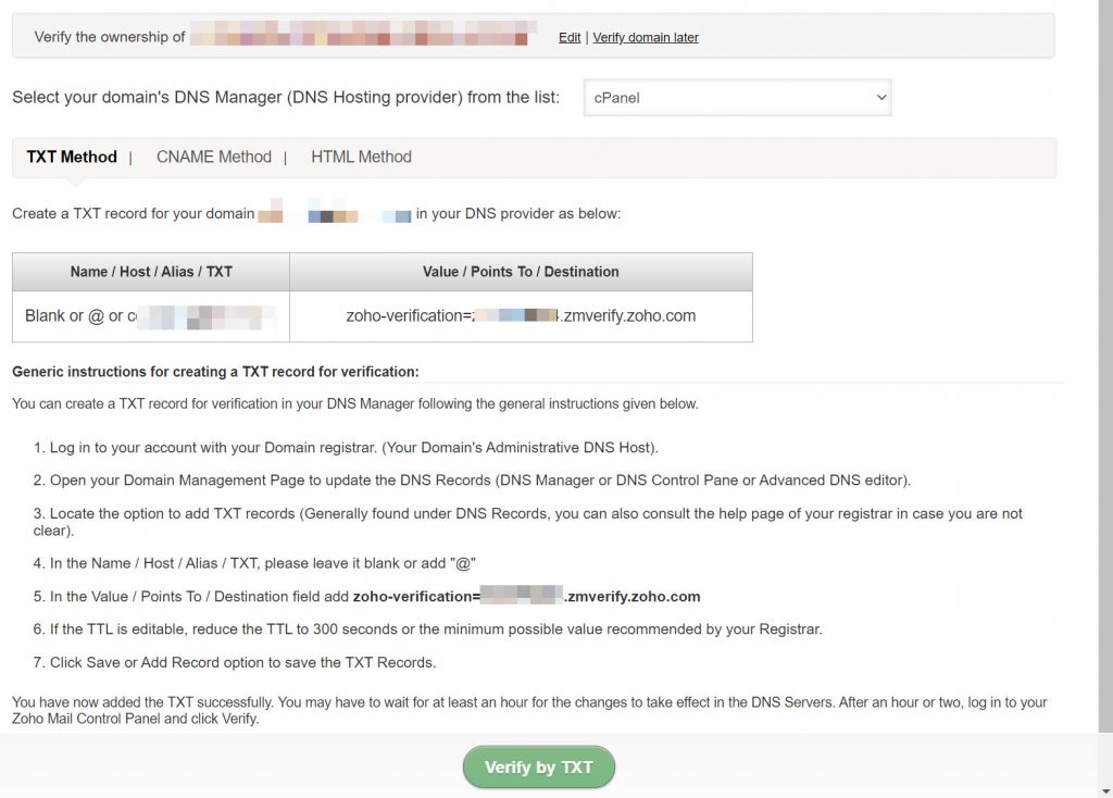 Step 4: Return to the Zoho page in your browser and click the blue Verify TXT button at the bottom.