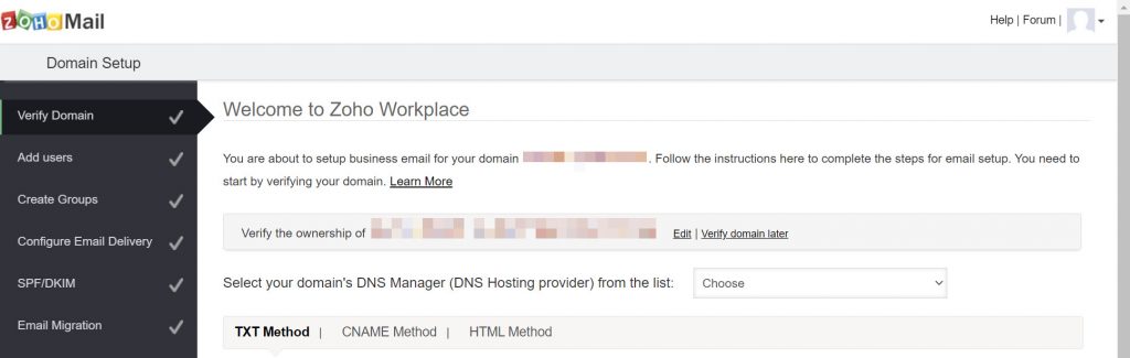 Step 2: After setting up your account, Zoho will ask you to verify you own the domain you’re trying to setup with their mail service.