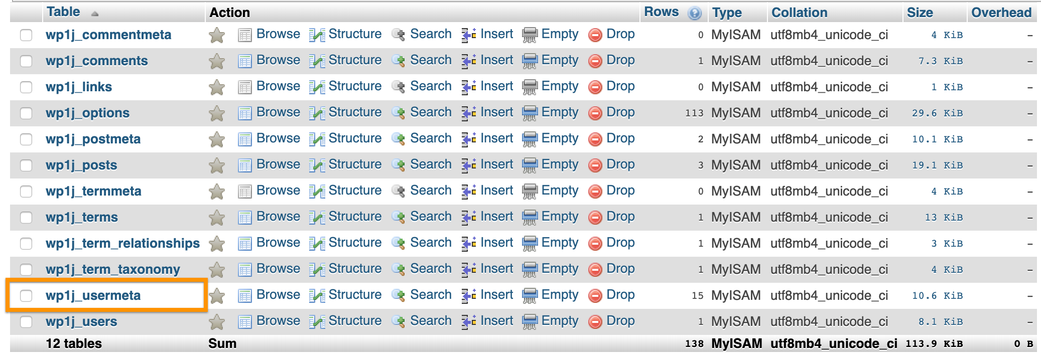 3) Now that we know the ID for the admin username, the next thing to do is to open the wp_usermeta or xxx_usermeta table in the database as highlighted. (wp_ is just the prefix, your table prefix may be different)
