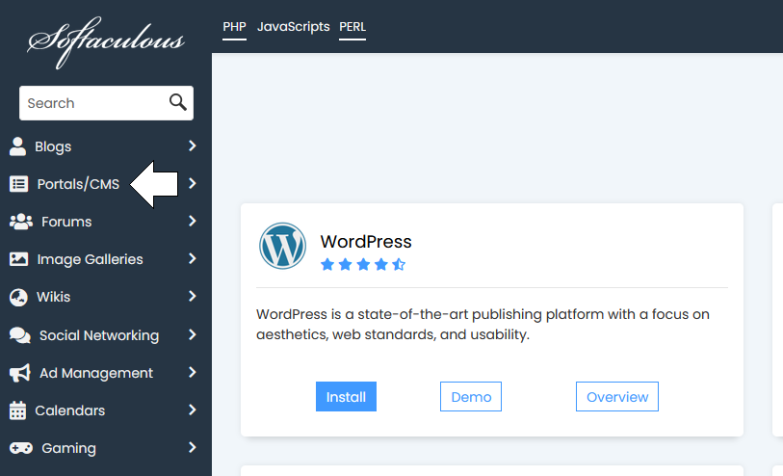 A new page will load, with a menu down the left side of the screen. On that menu, select ‘Portals/CMS’. When that sub-menu expands, we’ll find Concrete CMS on it. Click on Concrete CMS!