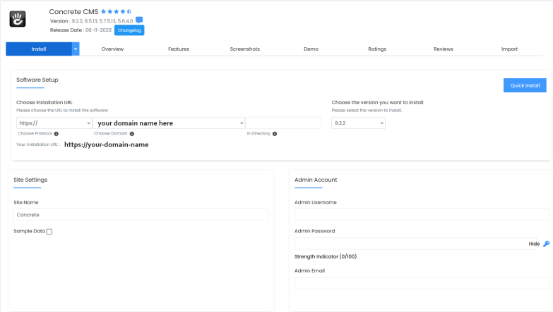 To install Concrete CMS – click the Install or Install Now button on the Overview.