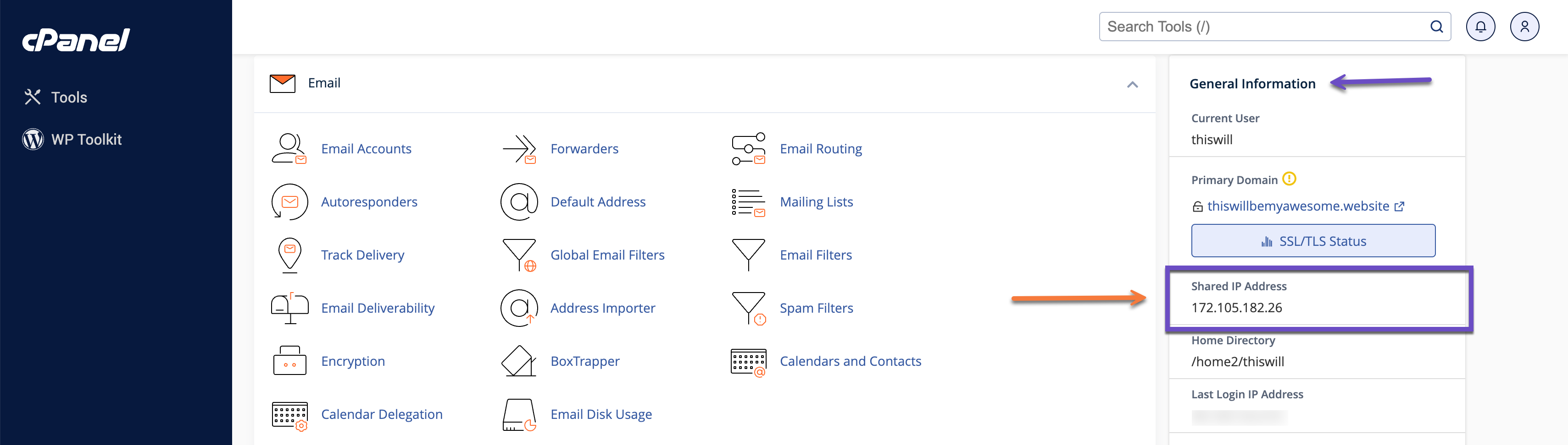 Alternatively, you can find your server’s IP address by logging into cPanel. Once logged in, navigate to the right-hand side of the dashboard to the “GENERAL INFORMATION” section. Here, you will see the “Shared IP address” listed, which is your server’s IP address.