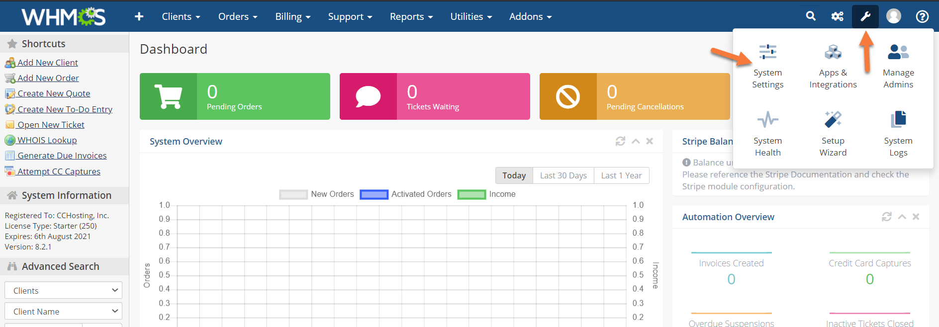 Step 1: Login to your WHMCS. Once you’ve logged in, open the System Settings by hovering over the wrench in the top right and clicking System Settings.