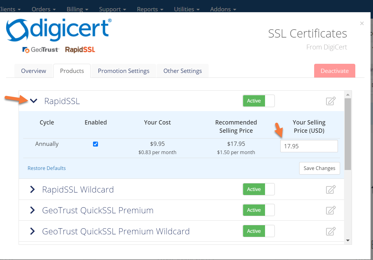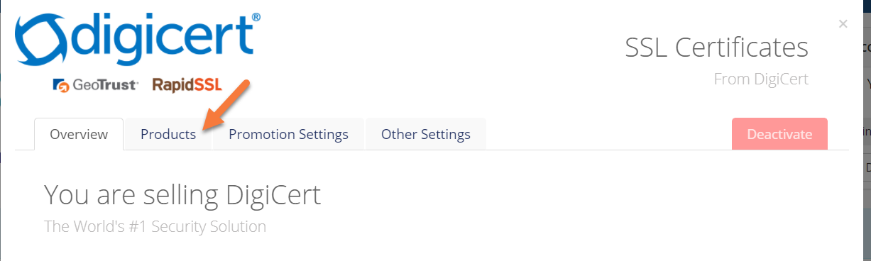 Step 4: For our example, we’ll be setting pricing for our DigiCert SSL Certificates. Click the Products tab.