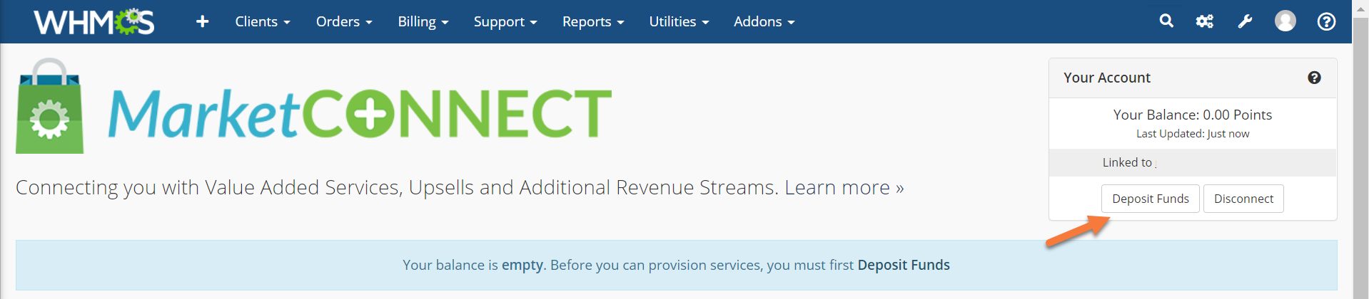 Use the steps below to add funds to your WHMCS MarketConnect account.