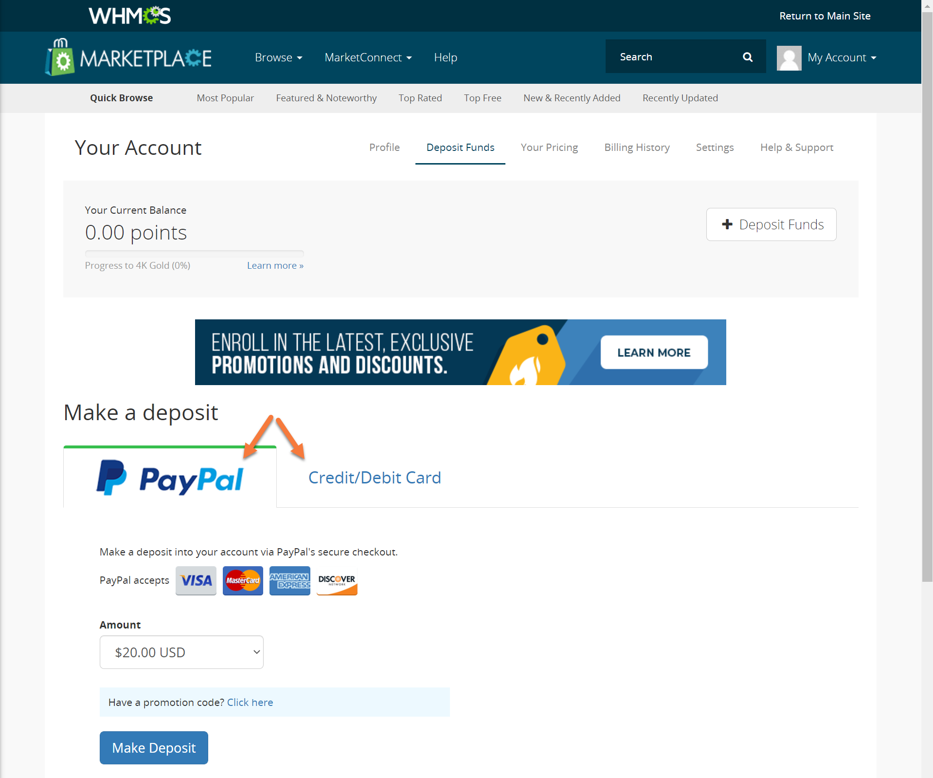 After clicking Deposit Funds, you’ll be taken to Your Account > Deposit Funds where you can use PayPal or a Credit/Debit card to deposit funds into your WHMCS MarketConnect account.