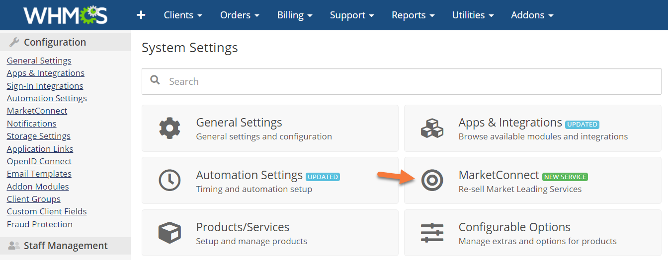 Before you can begin using MarketConnect, you must activate it in WHMCS.