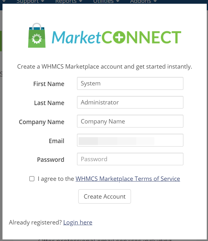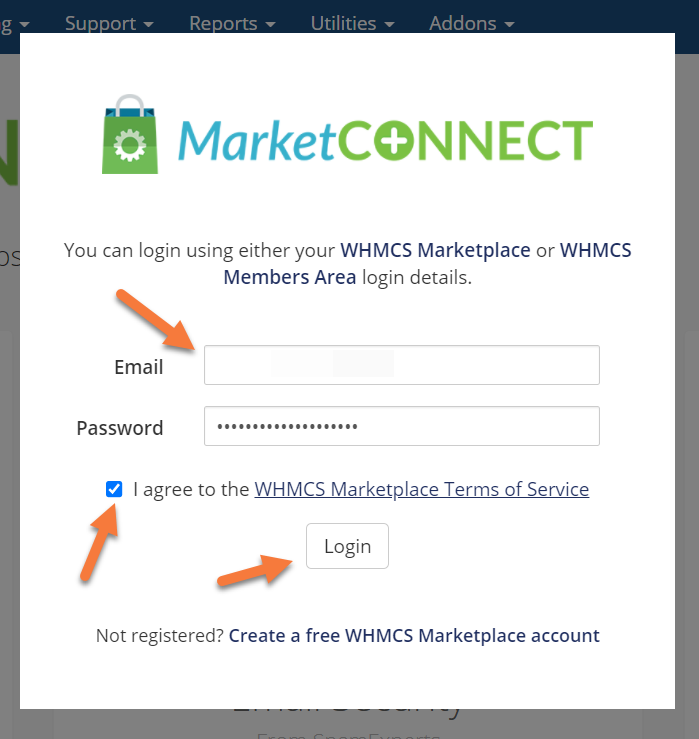 A modal will appear with the option to login to an existing account or create a new one. If you have an existing WHMCS Marketplace account, feel free to login. If not, click “Create a free WHMCS Marketplace account” at the bottom of the modal.