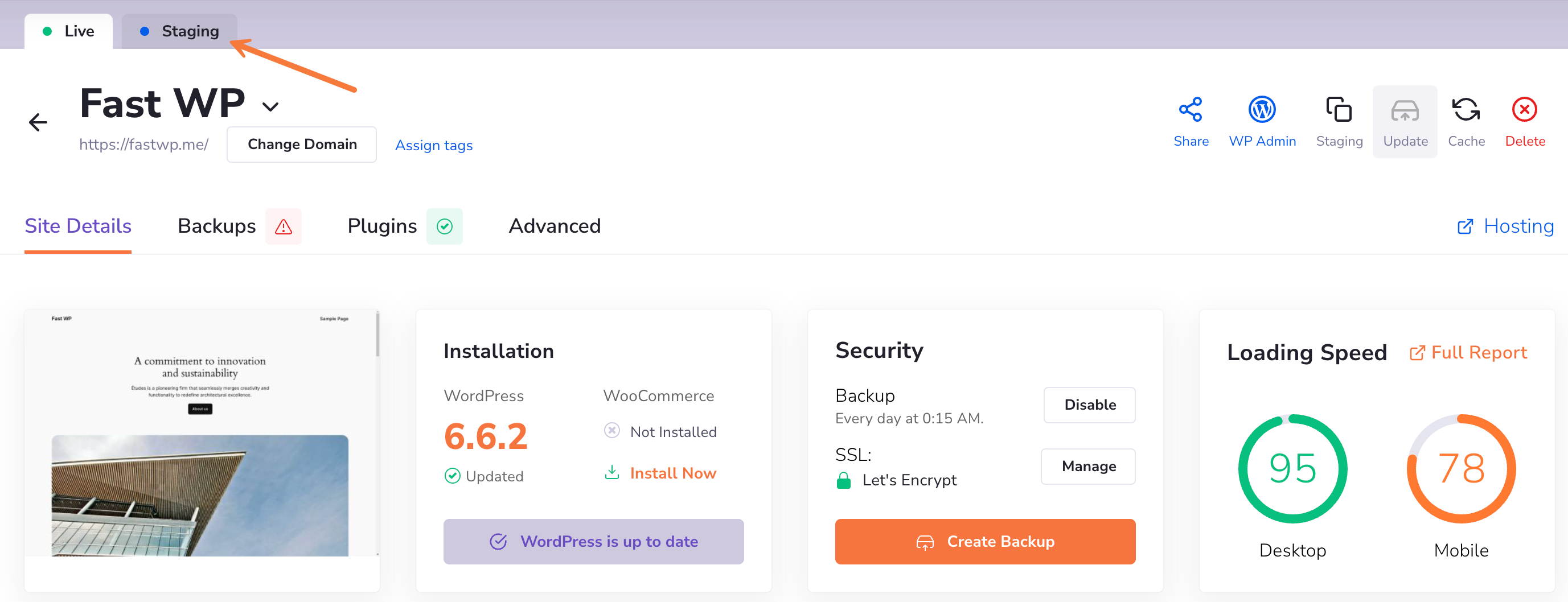 Step 6) To manage your new WordPress staging site, click on the “Staging” tab for your site.