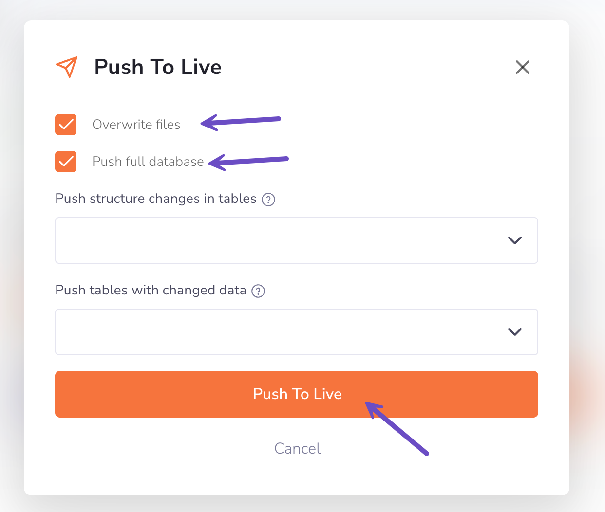 Step 5) To push the total changes you’ve made, select both files and database options. In case you wish to push only specific changes to your live site database, use the tables or structure push options.