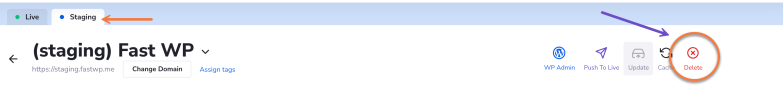 Step 4) Click on the Delete option in the quick actions menu to completely remove your WordPress staging site.
