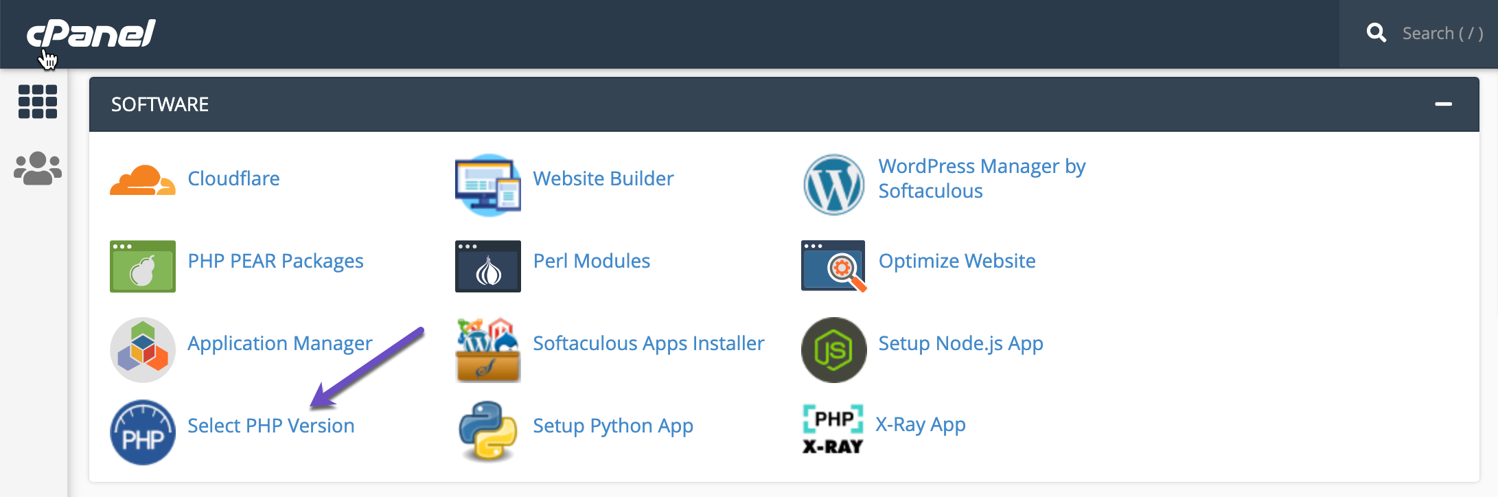 2) Navigate to the Software section and click on Select PHP Version.